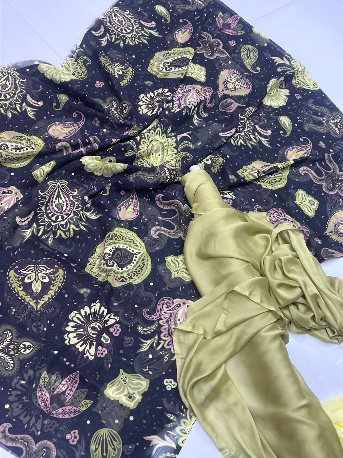 digital dirac is made of cotton wool and is a printed dirac fabric with beautiful digital prints. Complete set- dirac, gogorad (underskirt) and garbasar (shawl)